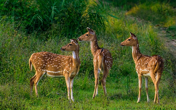 Chital (spotted deer), sambar, and gaur are among the most regularly sighted animals on any Kanha tiger reserve safari. The meadow zones are where barasinghas are sure to be sighted. Tiger and leopard stays are common but by no means guaranteed on any one safari. Dholes (Indian wild dogs) are seen in packs from time to time, and especially in the Mukki zone. Sloth bears are also seen at times close to the edges of the forest, mostly during the cooler months of the year. The variety of sights, even without an encounter with a tiger, makes a safari here worthwhile.